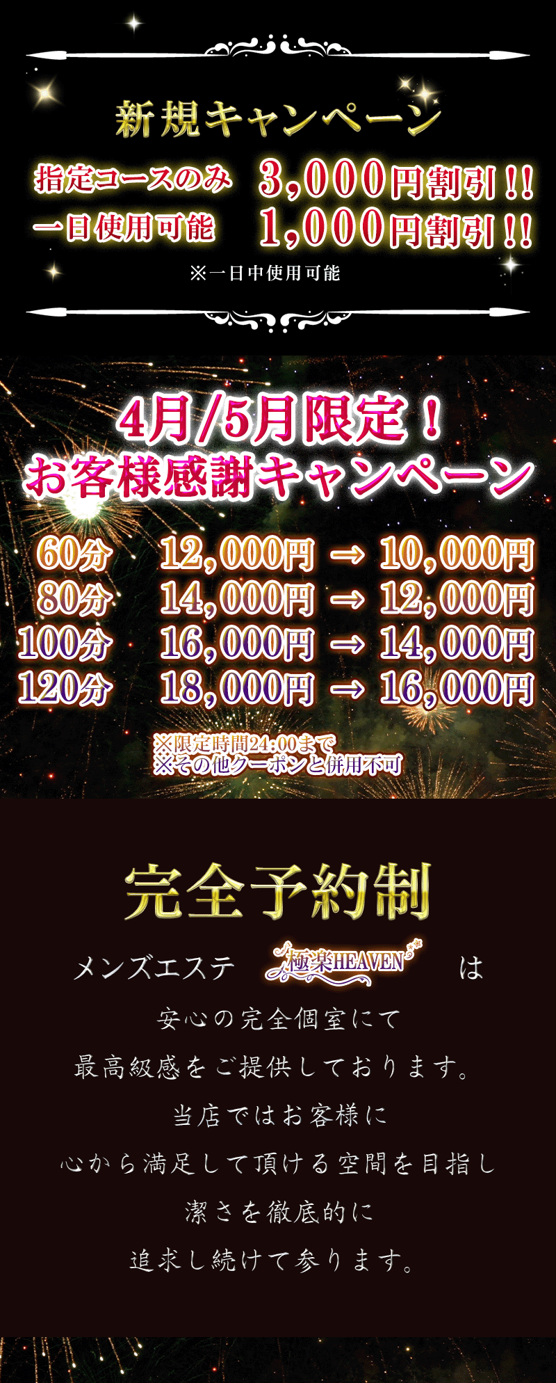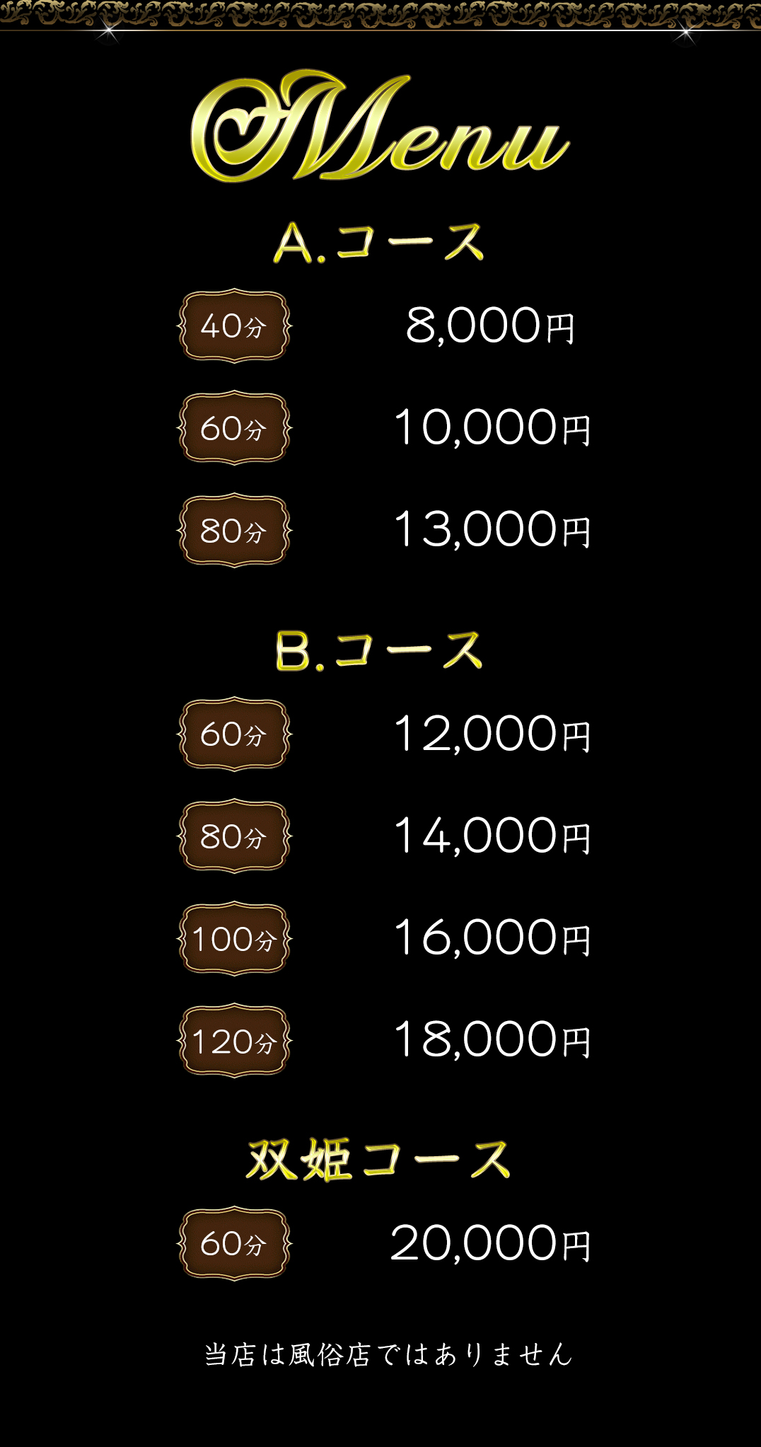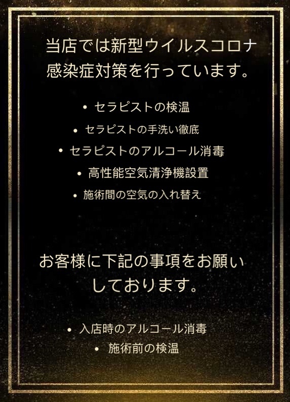 毎日頑張っている紳士の皆様、日頃の疲れになっている身体と心を、幸福なる雰囲気包まれた癒しの場所、落ちついた部屋の個室で可愛いセラピスト達がお待ちしております。当店のセラピストは若く容姿端麗にこだわりました、まるで蜜のように甘く幸せな空間でゆったりとした時間をお過ごし下さい。